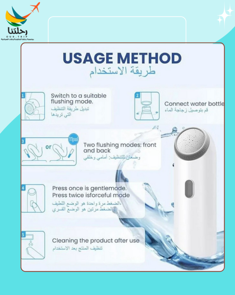 وظائف متعددة الأغراض: يُعد شطاف السفر المحمول الخاص بنا مثاليًا لمجموعة واسعة من الاستخدامات، بما في ذلك: